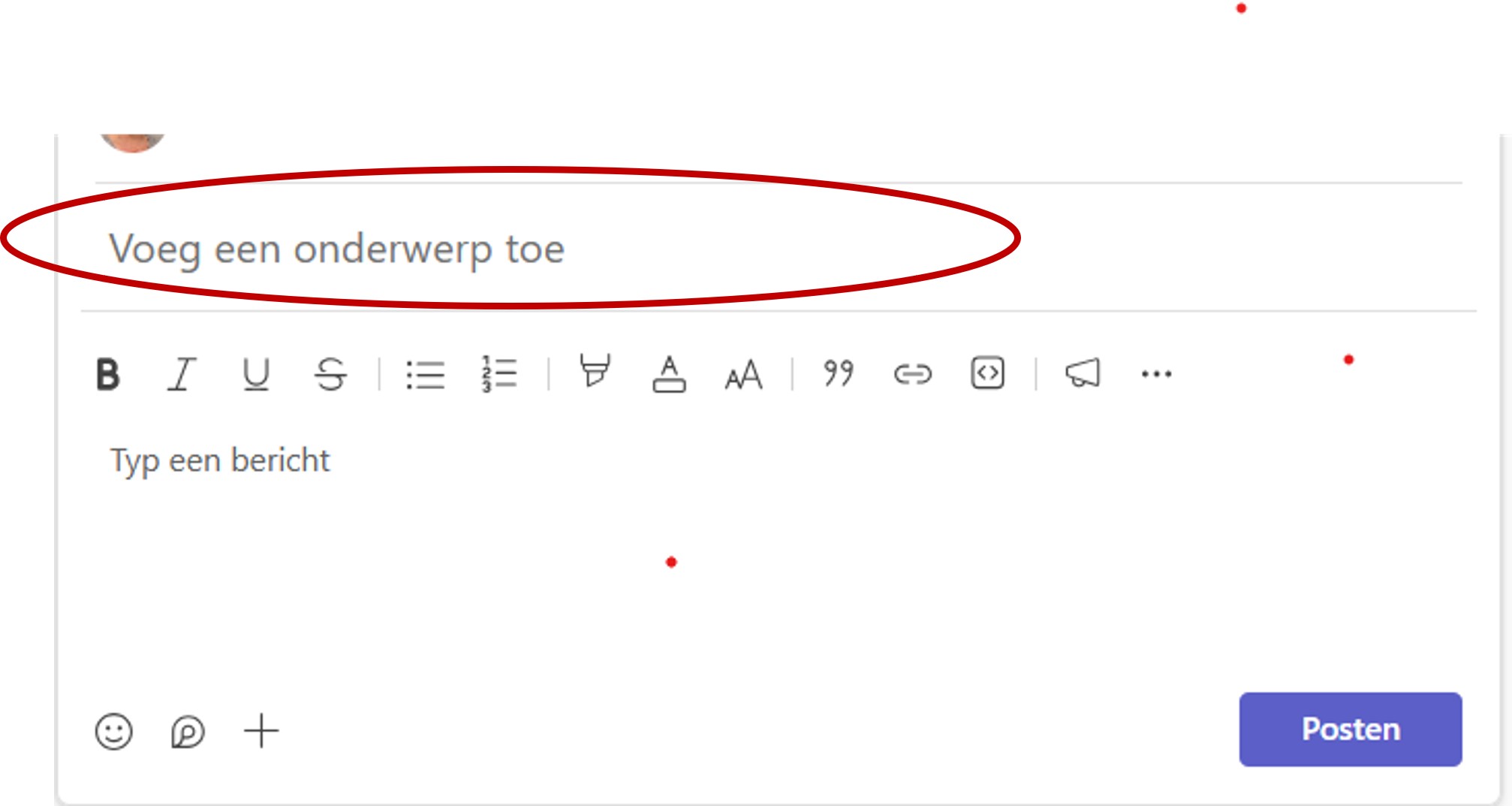 Bij veel berichten wordt het snel onoverzichtelijk. Gebruik net als bij e-mail altijd een onderwerp op het hoofdbericht. Dus zodra je op ‘posten’ klikt begin je ook hier bovenaan met een duidelijk onderwerp. Het liefst al met de gevraagde actie ‘overleg donderdag verplaatsen naar volgende week’ of ‘verslag overleg bijwerkt’